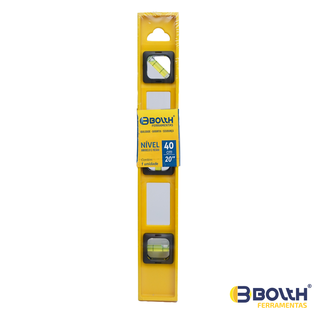 Leve e resistente, com 40cm e estrutura em plástico de ótima resistência. Bolhas de leitura: vertical, horizontal e 45°. Possui graduação em centímetros e polegadas. Orifício para pendurar, facilita o armazenamento. Reduzindo risco de empeno por queda.