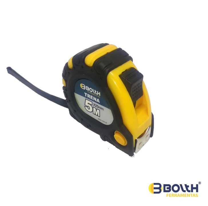 Corpo (caixa) em ABS emborrachado. Triplo botão de trava e freio. Fita de 25mm com ponta gancho magnético. Graduação em milímetros e polegadas. Design anatômico. Aferidas conforme ABNTN BR 10123. 5m x 25mm.