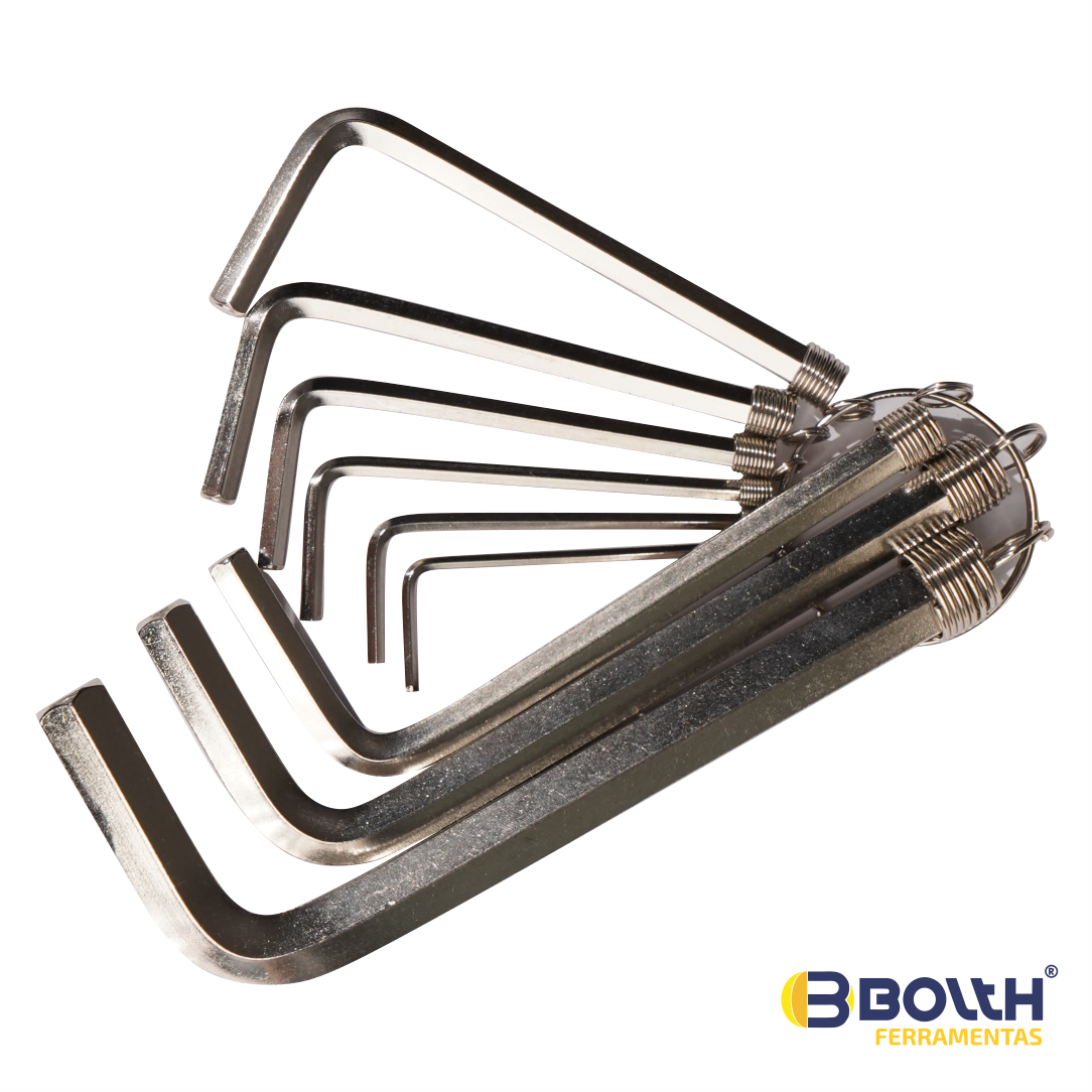 Jogo de chaves hexagonais longa com o corpo em forma de L com 2 braços de diferente comprimento, permite a aplicação de torque em parafusos posicionados em diferentes profundidades.