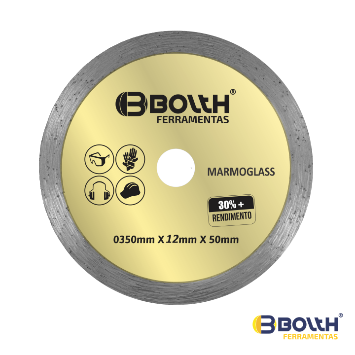 Serra de 350mm especialmente desenvolvida para corte de materiais especiais tais como: Marmoglass, Super Nano, Nanooglass, Porcelanato e similares. Possuem sistema de amortecimento tipo “Slots” facilitando para que se obtenha um corte mais eficaz e sem falhas. (Também pode ser utilizada em granitos e mármores importados)