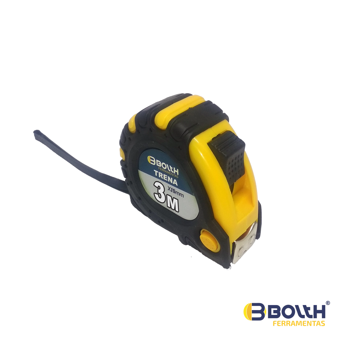 Corpo (caixa) em ABS emborrachado. Triplo botão de trava e freio. Fita de 19mm com ponta gancho magnético. Graduação em milímetros e polegadas. Design anatômico. Aferidas conforme ABNTN BR 10123. 3m x 19mm.