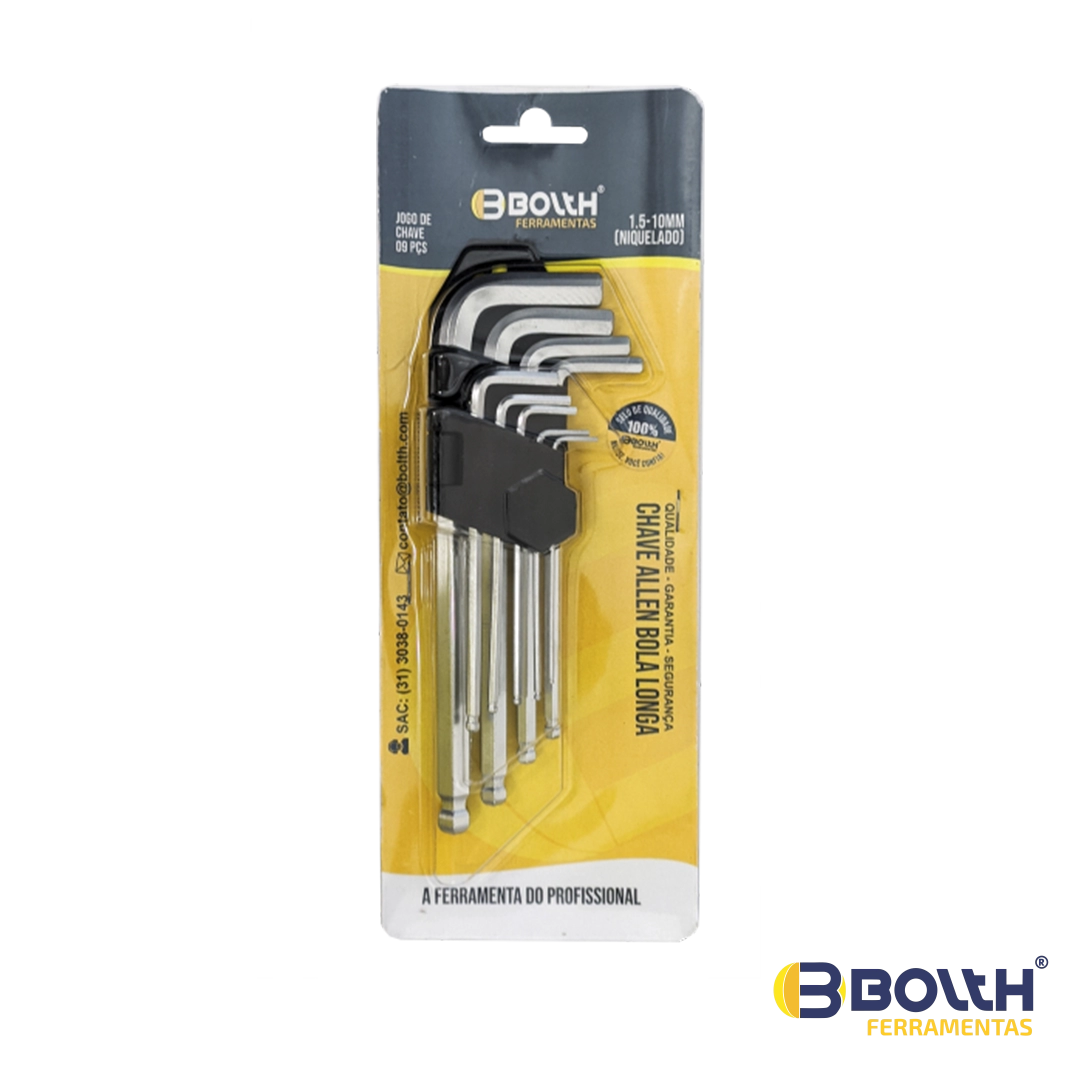 Conjunto de chaves contendo 9 peças, sendo indicado para uso profissional, com ponta abaulada e produzido em cromo vanádio, ideal para apertar parafusos com sextavado interno em locais de difícil acesso. Em umas das extremidades é abaulada, possibilitando o uso com uma inclinação de até 25º em relação ao centro do parafuso.